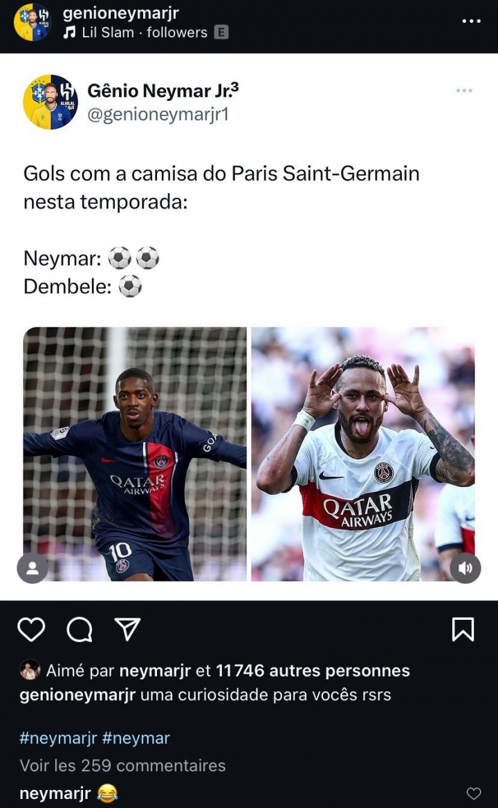 去年二月,一国外球迷晒出数据,表示内马尔本赛季为巴黎进球2粒,而登贝莱本赛季至今为巴黎进球只有1粒。内马尔在这条帖子下评论“”并点赞。(当时内马尔在转会去利雅得新月前对阵全北现代攻入2球)
