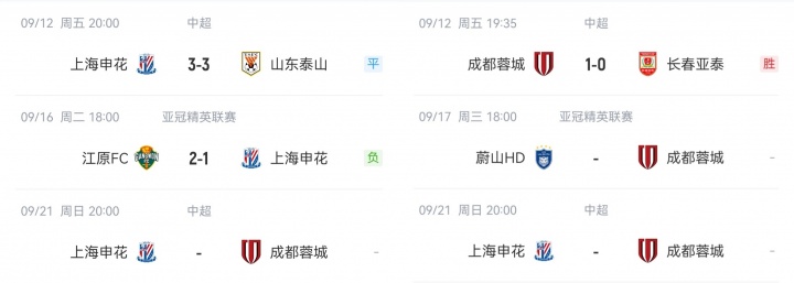 9月21日20点,申花主场迎战蓉城。