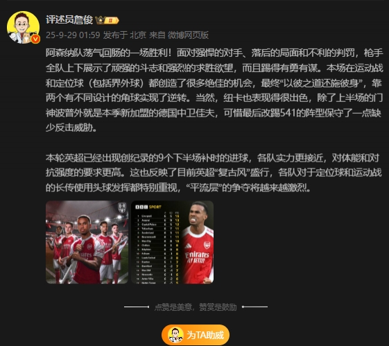 09月29日讯 阿森纳客场2-1逆转绝杀纽卡,赛后著名评述员詹俊先生在社媒发表点评。
